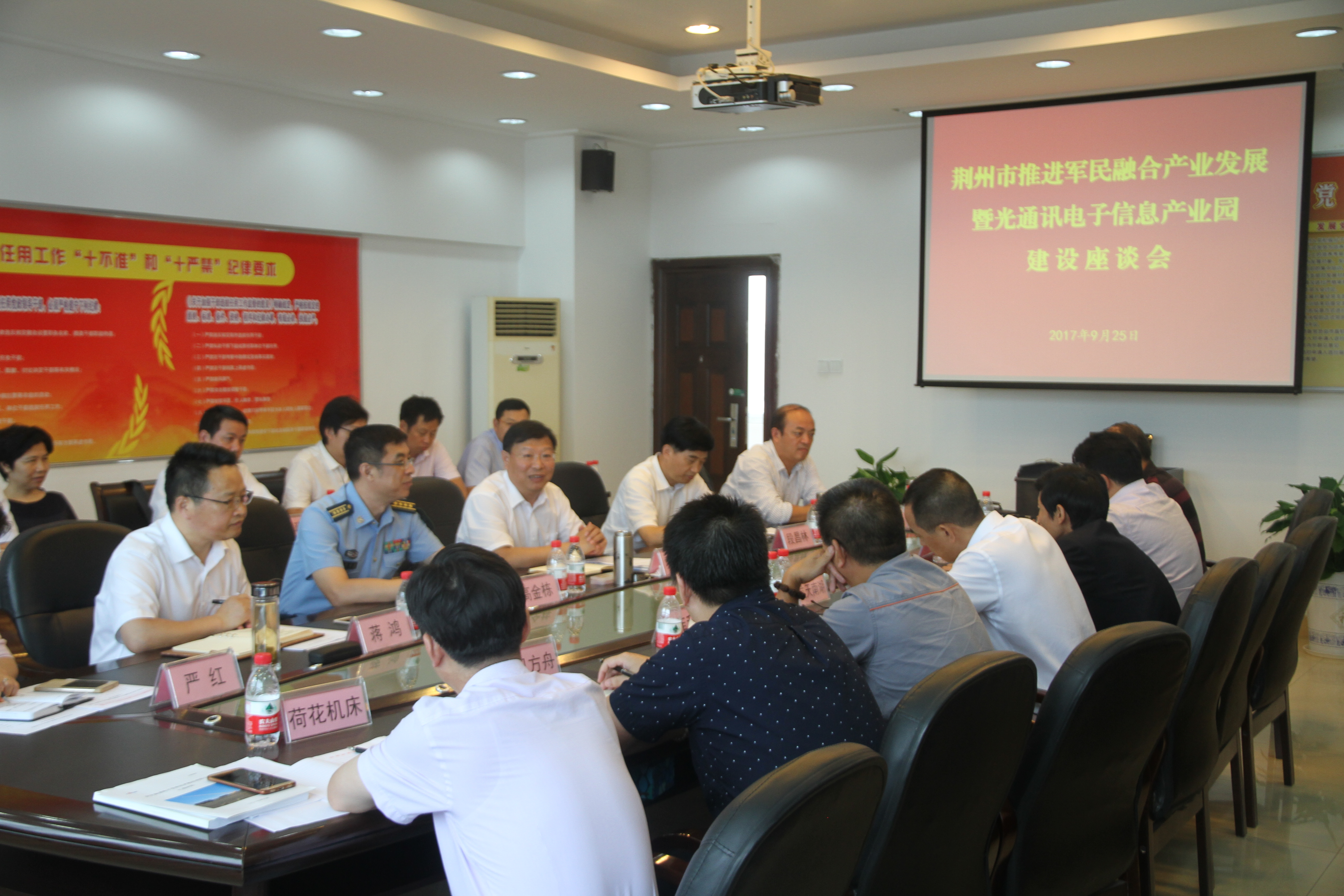 9月25日上午,市委书记、市人大常委会主任、荆州军分区党委第一书记杨智在市国资委主持召开推进军民融合产业发展暨光通讯电子信息产业园建设座谈会。荆州军分区司令员高金栋,市委常委、市委秘书长段昌林,市委常委、荆州开发区党工委书记蒋鸿,市政协副主席文艺,市委副秘书长严红出席会议,荆州开发区、市国资委、市发改委、市经信委、市招商局、市质监局、市审计局等部门领导及航天南湖公司、菲利华公司、凯乐科技公司、七一一厂、华讯方舟、白云机电、荷花机床等企业负责人参加座谈会。
