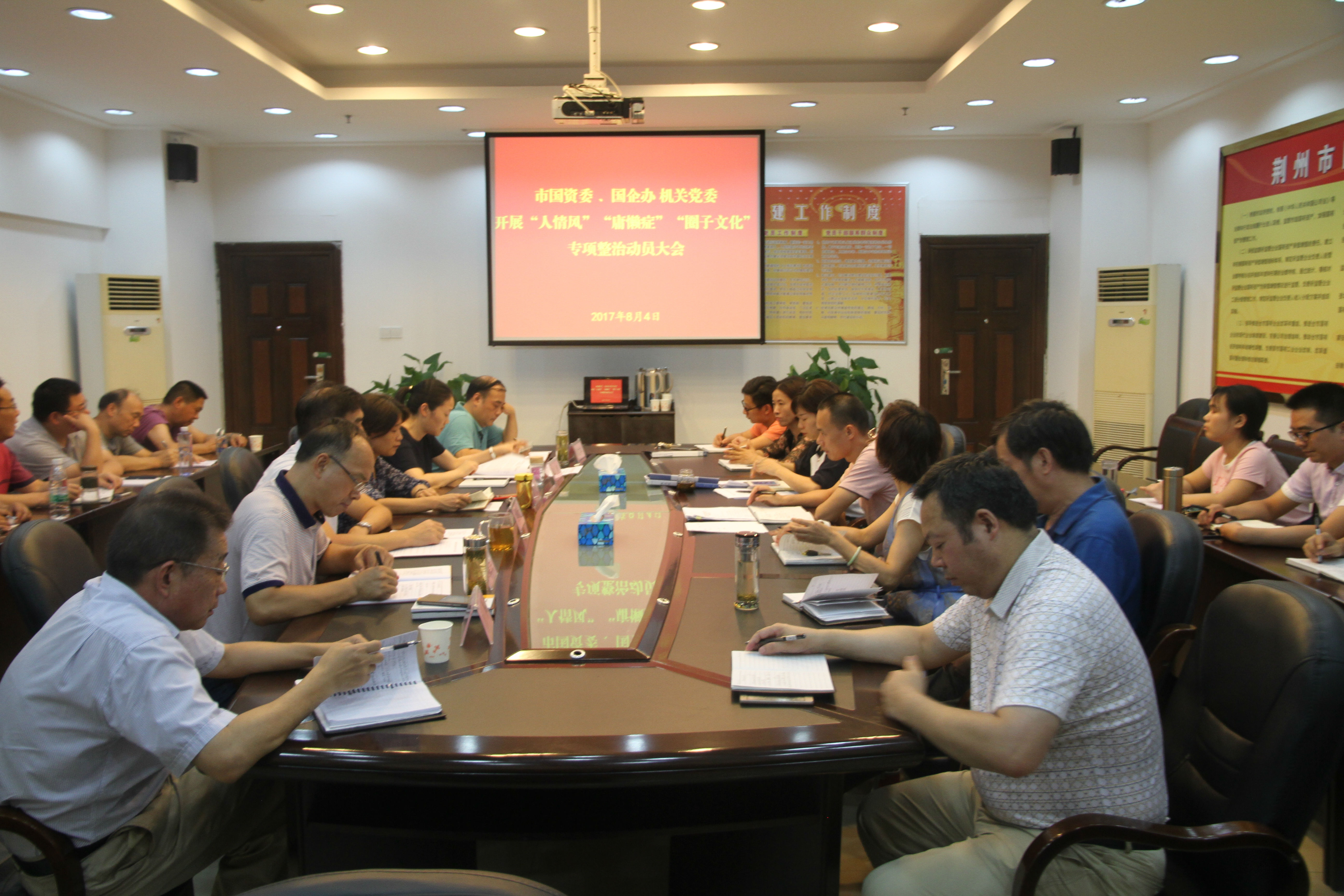 8月4日,荆州市国资委组织开展了“人情风”、“庸懒症”、“圈子文化”专项整治活动动员会,市国资委党委副书记、副主任陈必文主持会议,市国企改革办和委机关全体成员参加会议。