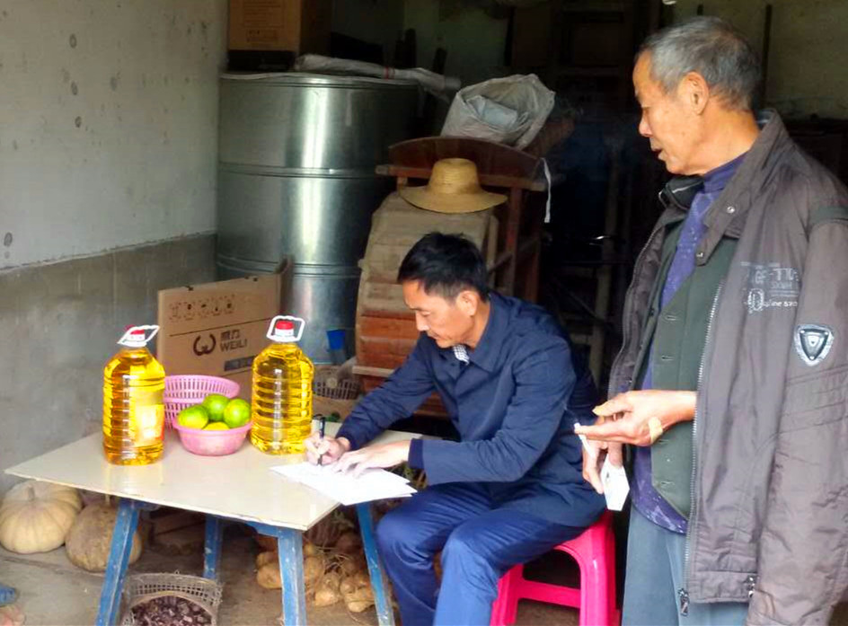 图为局长邹国斌走访慰问贫困户,并填写扶贫日志