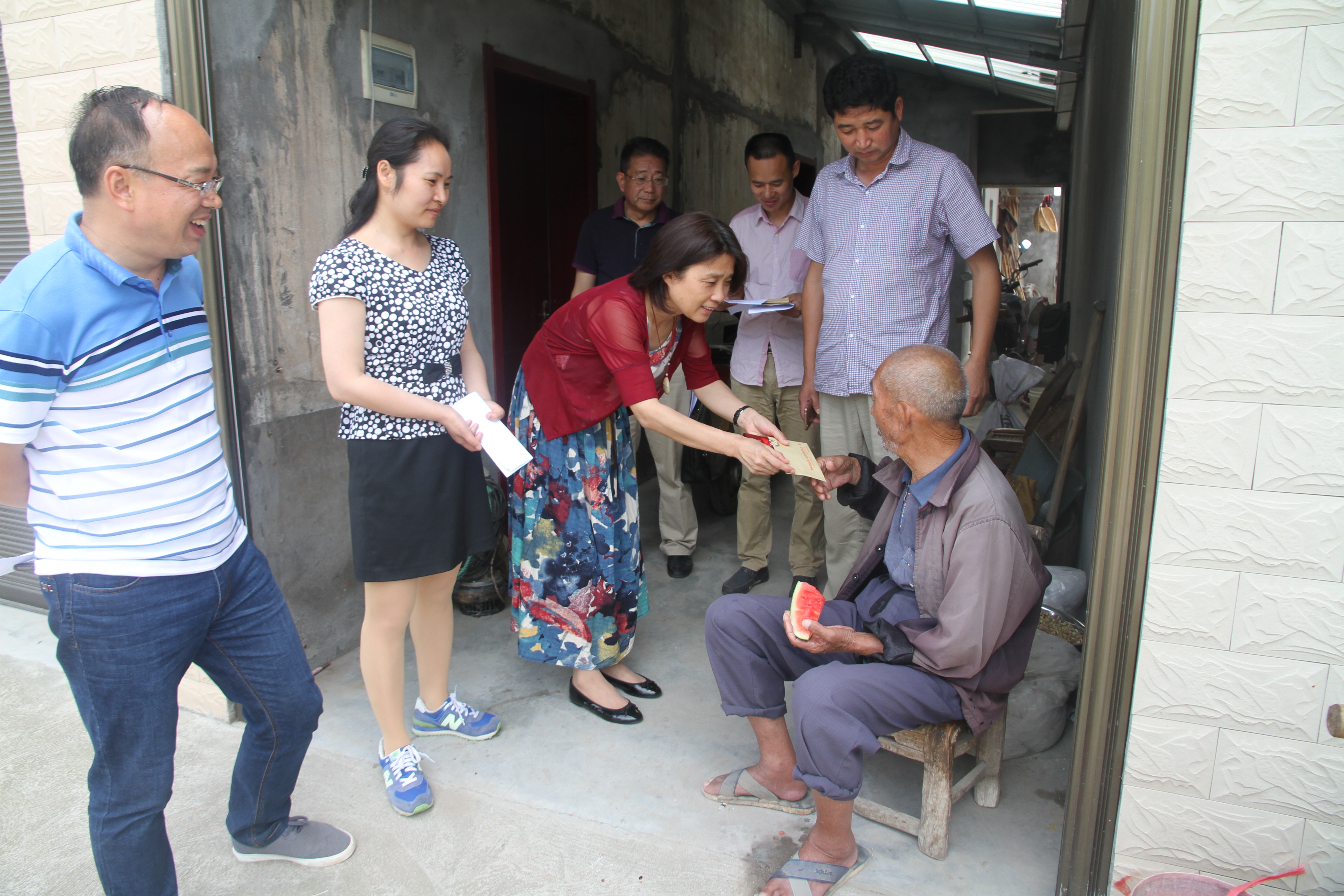 6月28日上午,在建党96周年即将来临之际,荆州市国资委党委书记、主任熊鹰,党委副书记陈必文,市国企改革办副主任朱荣带领市国资委扶贫工作组人员,在江陵县副县长乐梅、马家寨乡党委书记贺伟陪同下,到扶贫联系村杨渊村走访慰问困难党员和老党员,为他们送上党和政府的关怀和温暖。